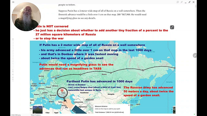 Putin not cornered - on 2 meter map of Russia advanced just over 1 cm in Donbas in 1000 days - can't cross river Dnipro in Zaporizhia or…