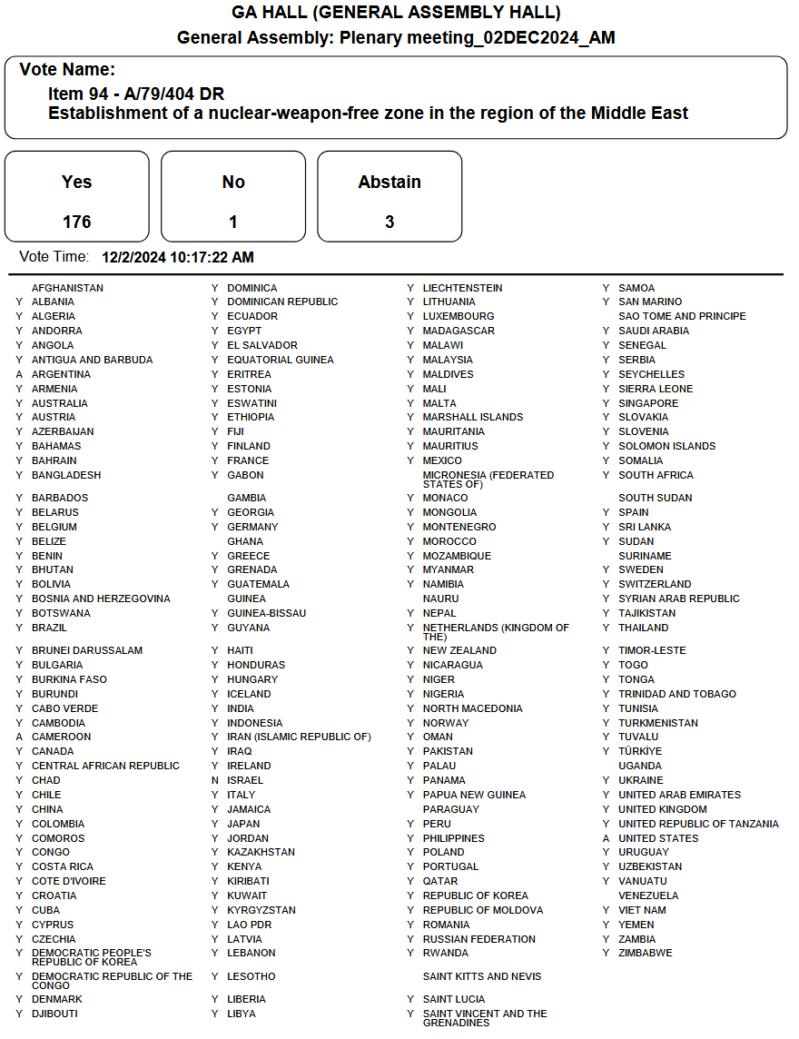 Only Israel votes against the resolution to establish a nuclear weapons free zone in the Middle East, and three minor abstentions