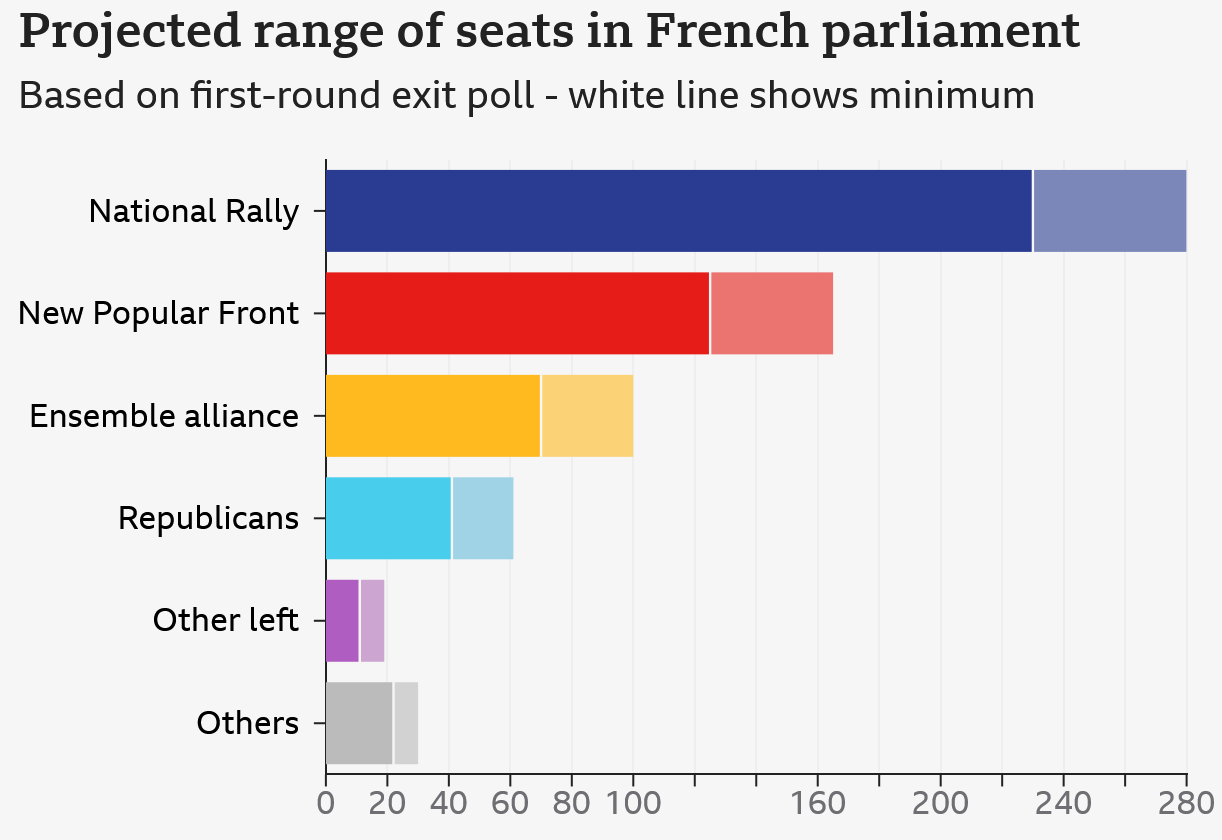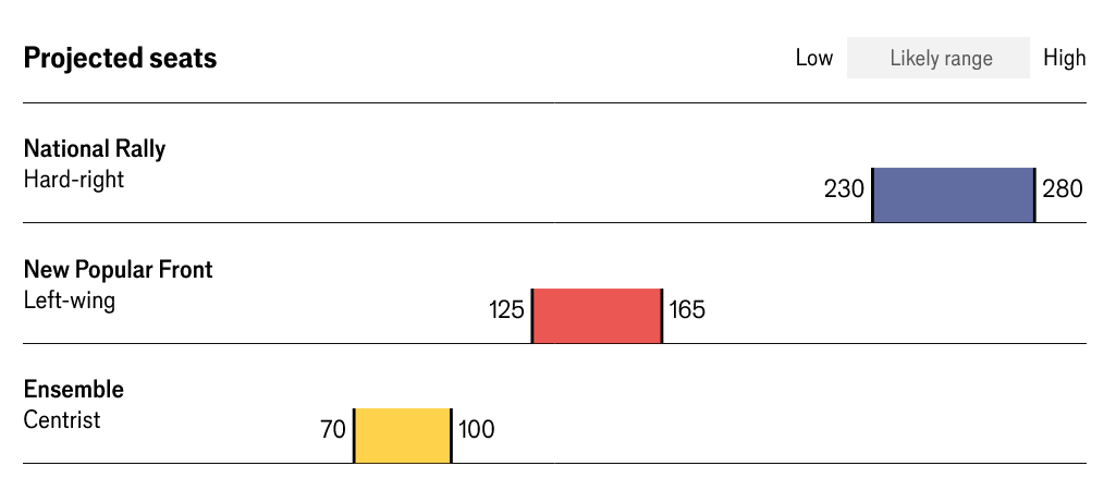 Current projections are for National Rally to get 230 to 280 seats but not quite reach the absolute majority of 288 as a single party