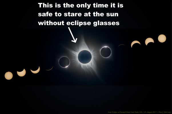 The only time it’s safe to look directly at the sun during an eclipse is when the rest of the sky goes dark and the sun’s corona shows. Before that you get the diamond ring effect - even though it’s just a chink of sun, it’s still not okay to stare with naked eye vision. Your pupils are wide open and your eyes are vulnerable.