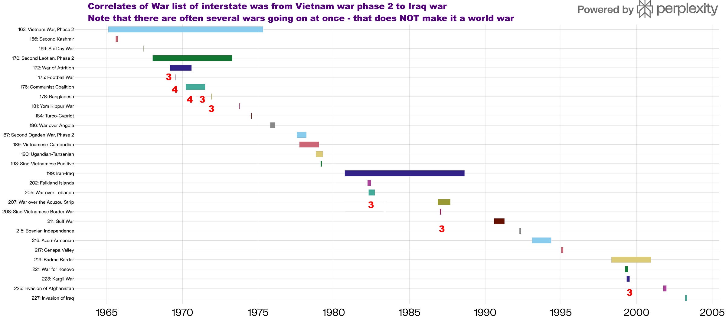 That is not unusual. From the graphic it was 6 occasions with 3 wars simultaneously and 2 occasions with 4 wars from when I was 11 to when I was 50. That makes it at least 3 simultaneous wars roughly twice a decade.