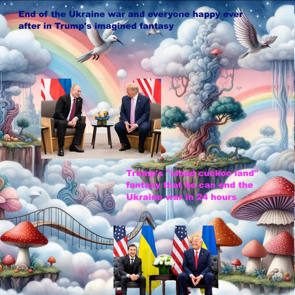 The background graphic here is made with copilot, with Trump / Putin / Zelensky pasted on top. Because of the topic “Cloud Cuckoo land” and there isn’t any preset idea of what Cloud Cuckoo Land would look like then it kind of worked I thought :)