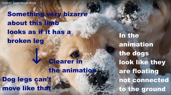 And there is no way to direct any of this. E.g. you can't say "Fix that puppy's broken leg". You can't even say "please do an animation of puppies playing in the snow where none of them have broken legs" because Sora clearly is not able to figure out how puppy legs are supposed to move.