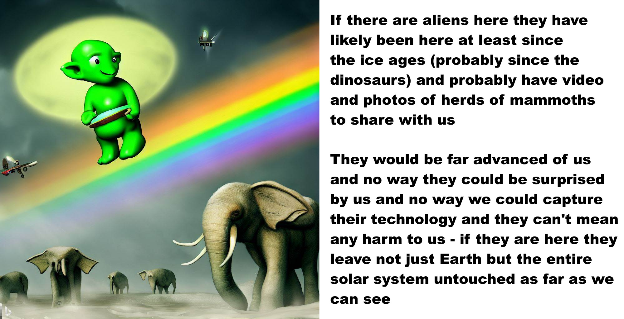 If there are aliens they have likely been here at least since the ice ages (probably since the dinosaurs) and probably have video and photos of herds of mammoths to share with us.