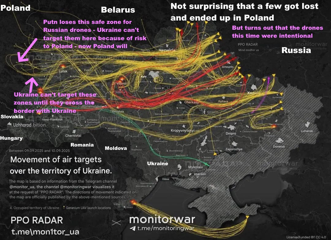 Putin did deliberately send those drones into Poland. That is clear now. But why? Up to now Poland and Romania have been like safe territory for his drones - they can veer off into those countries on their way to Ukraine and know they won’t be shot down until they return to Ukraine. Why force Poland to shoot down your droens and lose that safe haven - and pretty much force Victor Orban, Putin’s closest friend in NATO / EU, to denounce him and side with Poland?