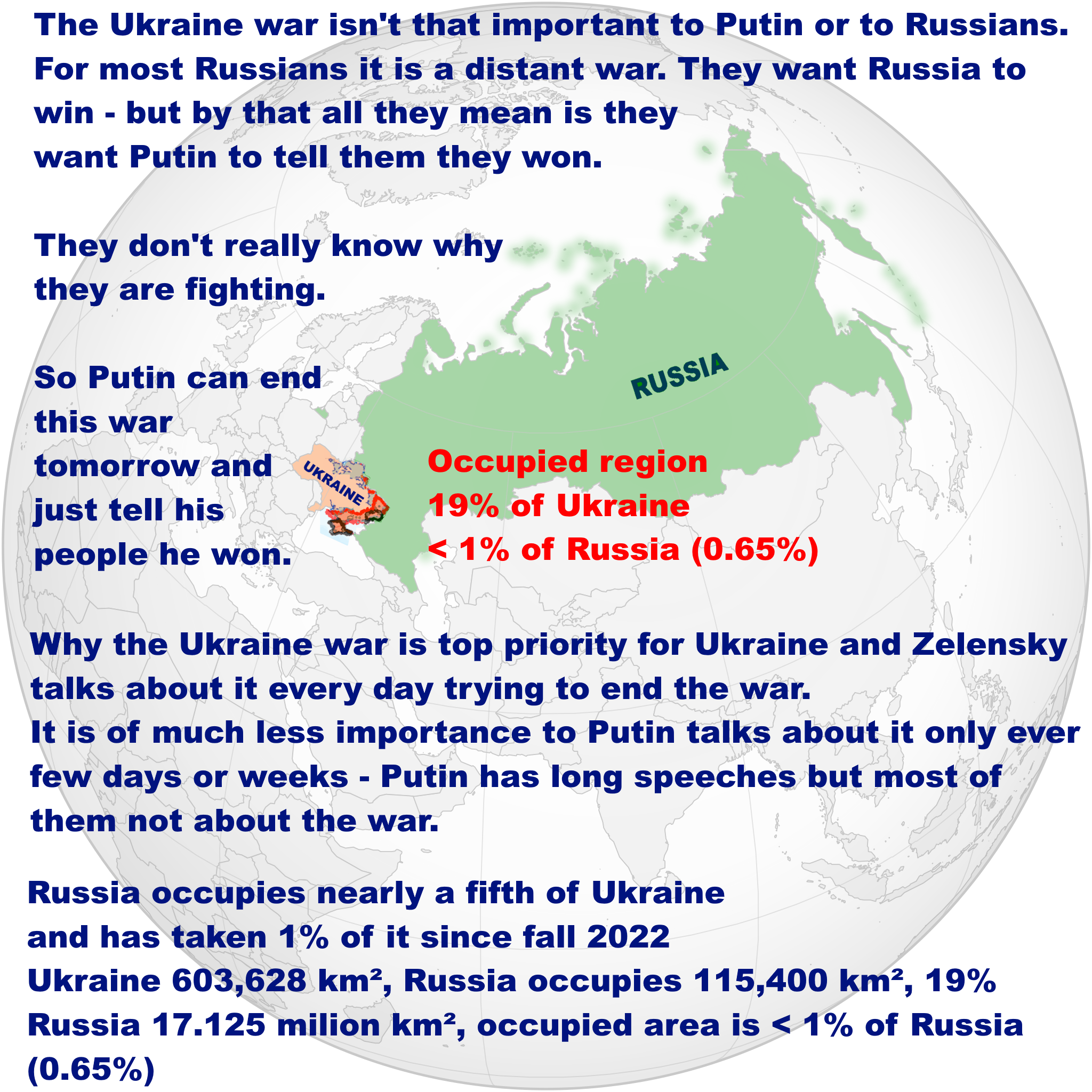 The Ukraine war isn't that important to Putin or to Russians. For most Russians it is a distant war. They want Russia to win - but by that all they mean is they want Putin to tell them they won.
