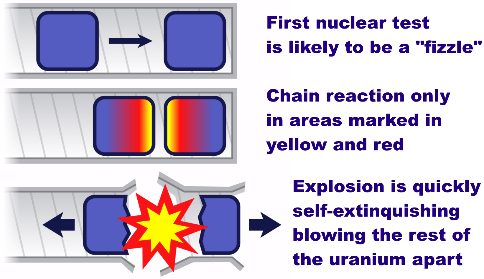 In this diagram the blue is the uranium and the red is the part that detonates. When the two chunks are brought together if they aren’t brought together fast enough or stay together firmly enough for long enough then just the part in contact starts to explode but it blows the two chunks apart and you end up just scattering highly enriched uranium over a large area.