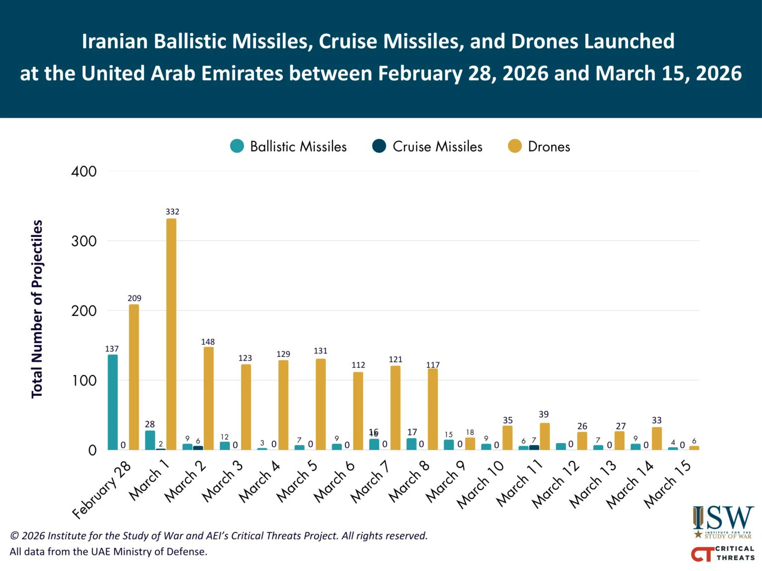 The ballistic missiles are way down, last few days, down to 3 on the 4th March. Slowly increased since then to 16.