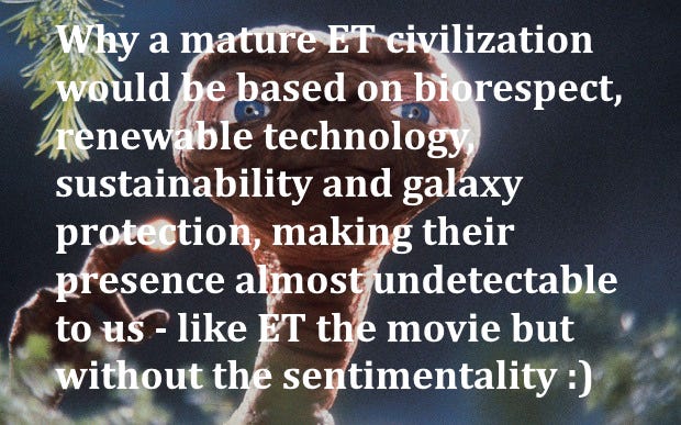 Why a mature ET civilization would be based on biorespect, renewable technology, sustainability and galaxy protection, making their presence almost undetectable to us - like ET the movie but without the sentimentality