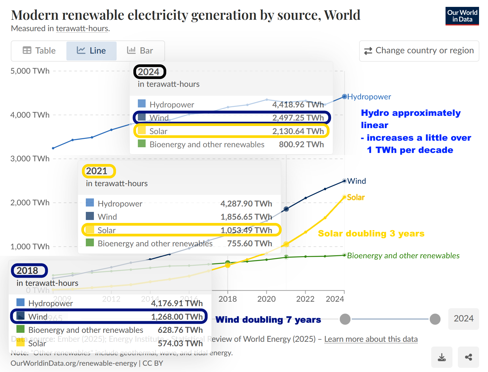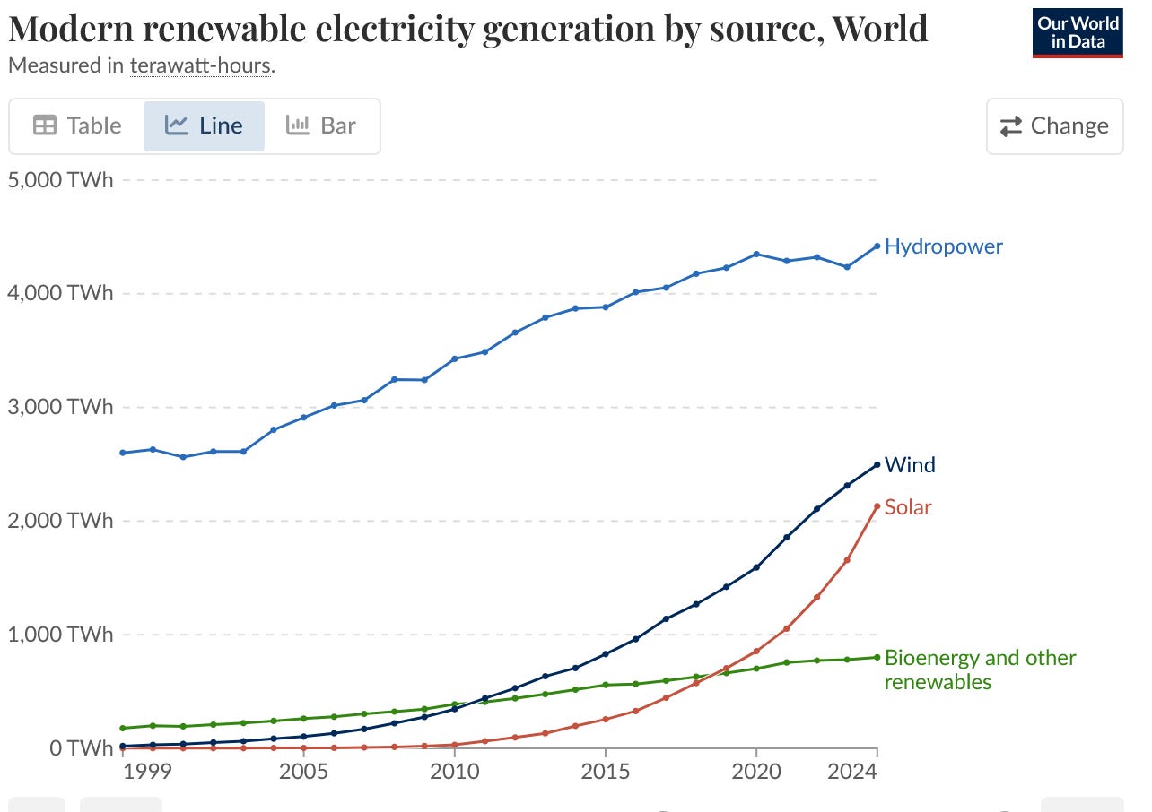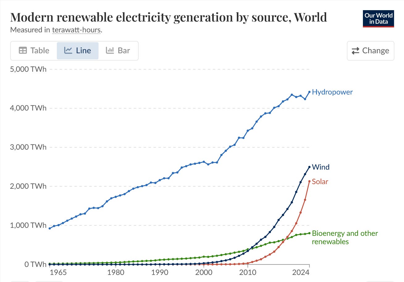 If you look under the hood, Hydropower still dominates renewables but it’s growing linearly, adding a bit over 1 terawatt per decade of renewable electricity.
