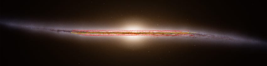 A side-view simulation of our Milky Way Galaxy, showing the orbit of 3I/ATLAS (in red) versus our Sun. Credit. M. Hopkins/Ōtautahi-Oxford team. Base map: ESA/Gaia/DPAC/Stefan Payne-Wardenaar. CC-BY-SA 4.0. A side-view simulation of our Milky Way Galaxy, showing the orbit of 3I/ATLAS (in red) versus our Sun. Credit: M. Hopkins/Ōtautahi-Oxford team. Base map: ESA/Gaia/DPAC/Stefan Payne-Wardenaar. CC-BY-SA 4.0.
